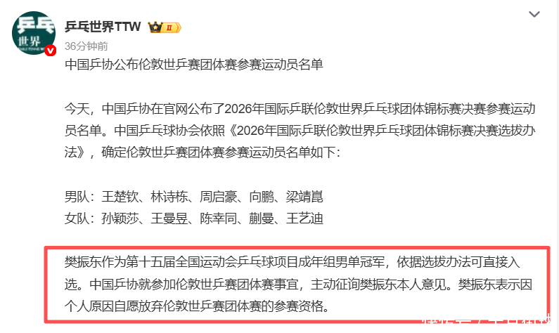疑问的答案,在4月8日晚终于揭晓。中国乒协正式公布伦敦世乒赛团体赛参赛名单,樊振东的名字再次缺席,这让原本就因许昕言论而沸腾的乒乓圈,彻底陷入热议。公告里写得明明白白,协会主动征询了樊振东的意见,是他本人因个人原因,自愿放弃了参赛资格。真相终于水落石出,不是国家队不征召,而是征召之后,这位曾经的男队核心,选择了不来。